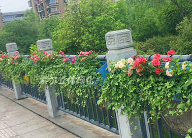 護欄綠化,考慮到要形成立體景觀及遮擋容器,植物要求以開花植物及藤本植物為主,用時令花草及藤本灌木,形成有層次的有色彩帶的立體效果。